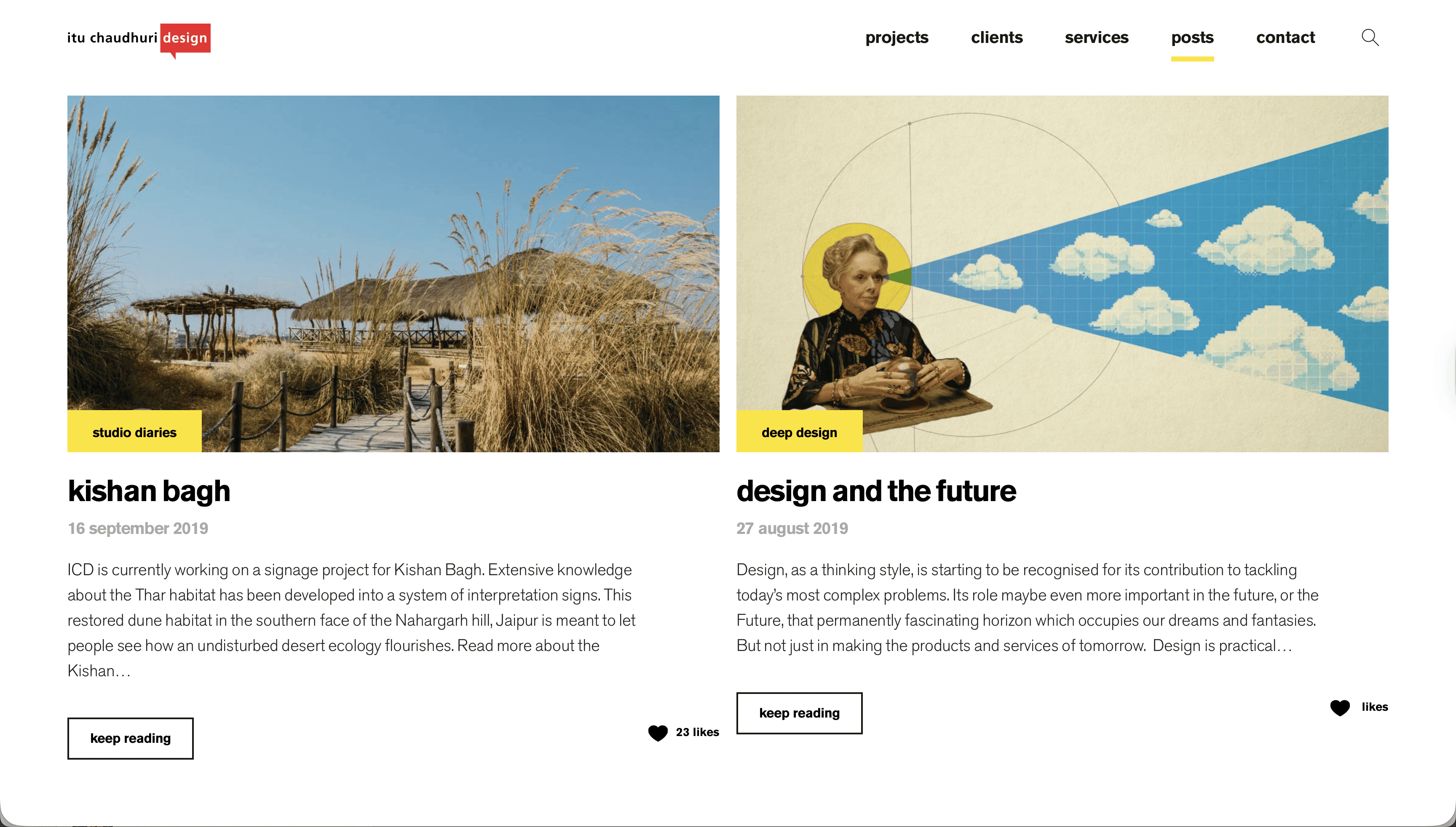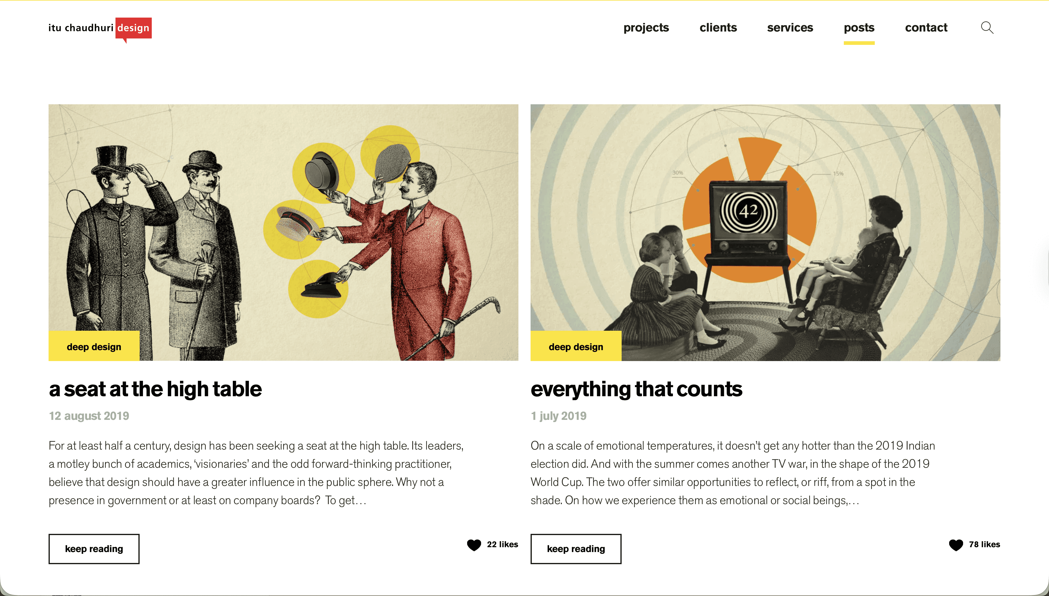 Each illustration was treated as its own small editorial exercise. Collage, found imagery, geometry, and colour work together to capture the feeling of the piece rather than directly illustrate its content. The "Design and the Future" visual pulls a vintage portrait into a geometric composition with blueprint grids and clouds, referencing history, vision, and the slightly unknowable nature of what design is actually pointing toward. The approach gives the blog a visual identity that feels consistent without being formulaic.